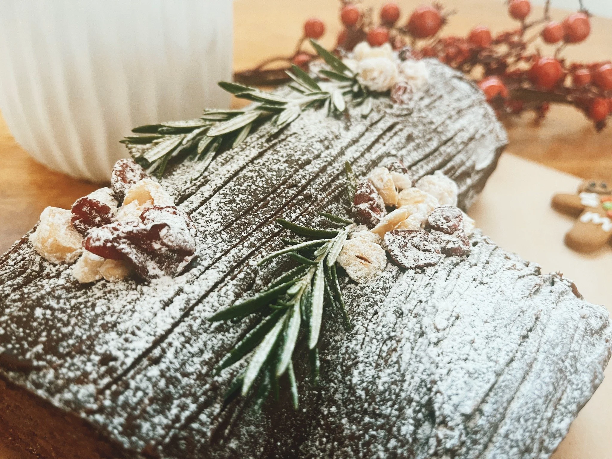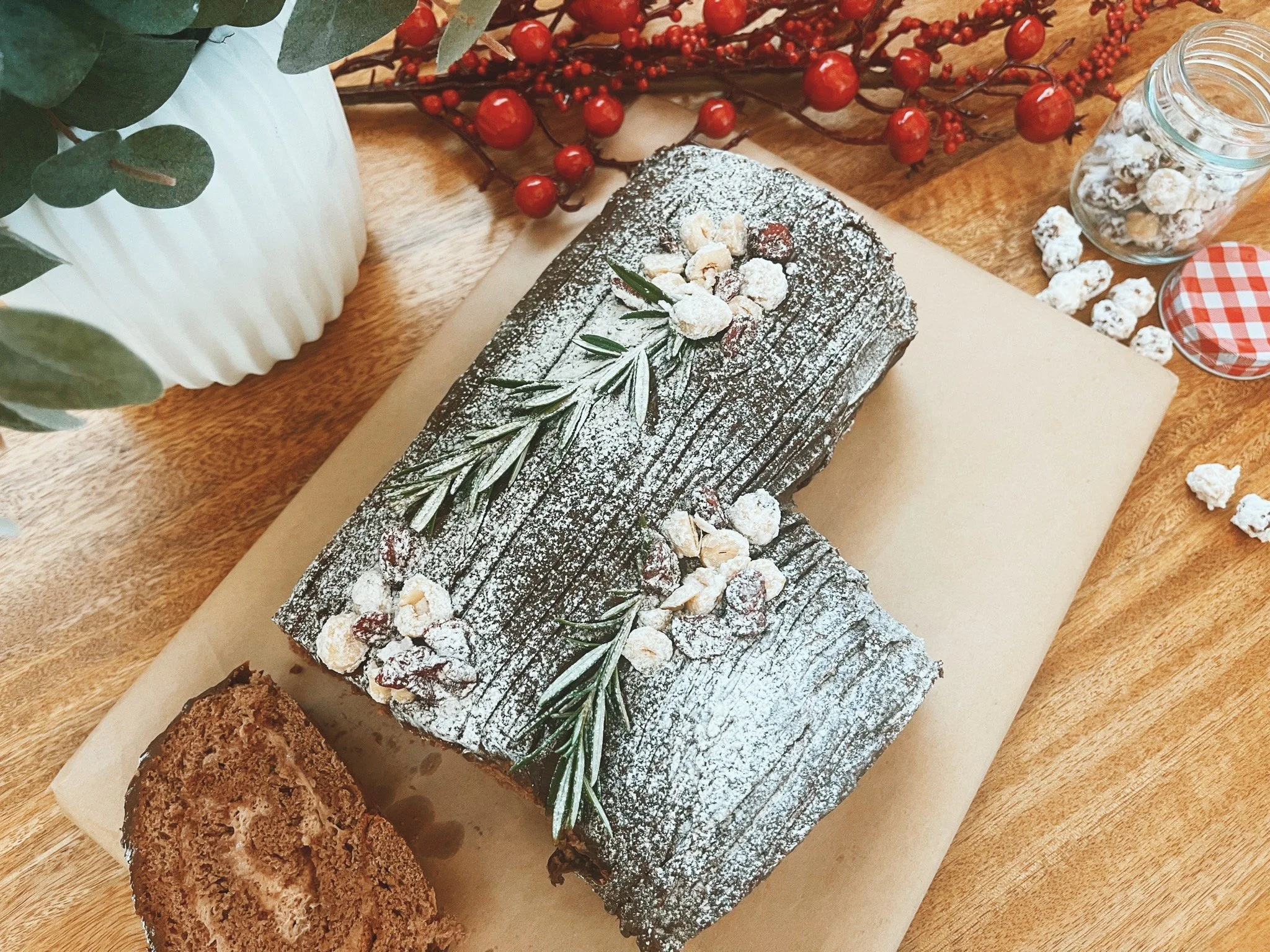 Our Yule Log is a chocolate sponge rolled around freshly whipped chocolate cream with a hint of hazelnut flavour. Coated in chocolate ganache, dusted with icing sugar, and decorated with a Christmas flair of crystallised hazelnuts, dried cranberries and rosemary.